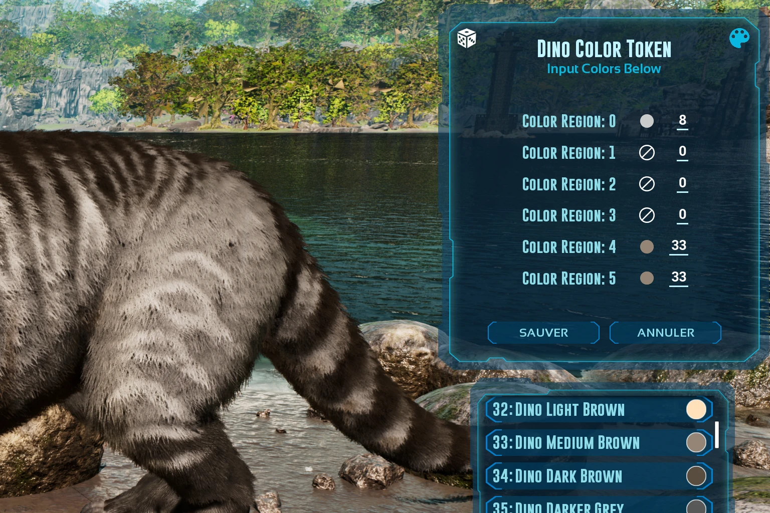 Le menu Dino Color Token s’ouvre et affiche les différentes zones modifiables ou non du dino,